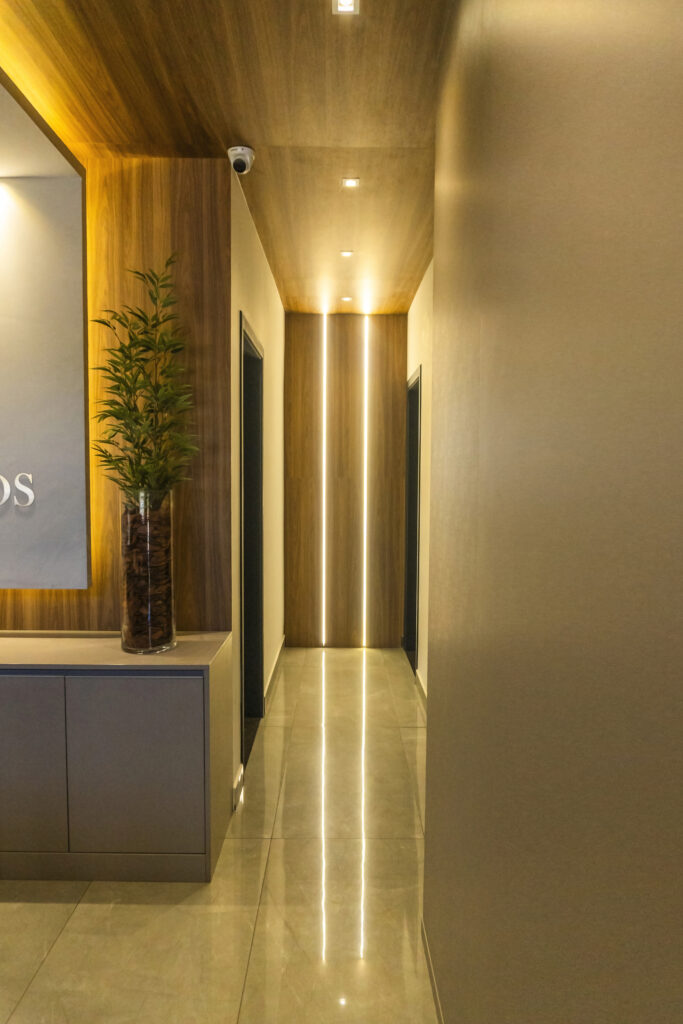 A iluminação interna foi pensada em camadas. Luz difusa para conforto visual, iluminação indireta para valorização dos planos e pontos direcionados para destaque de áreas estratégicas. O resultado é um espaço equilibrado, que transmite segurança e estabilidade.