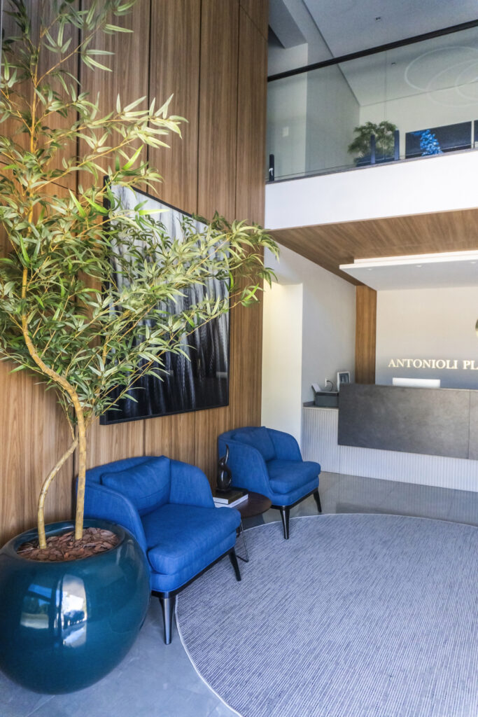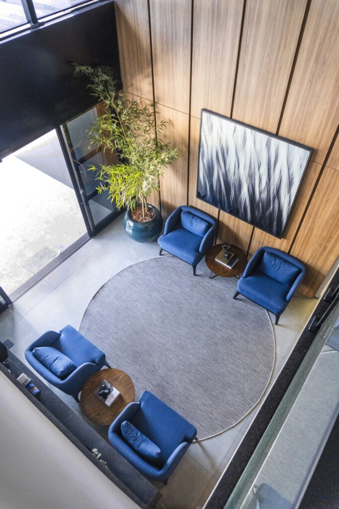 O uso estratégico da madeira em planos verticais contribui para uma atmosfera mais humana, sem comprometer o caráter corporativo. A paleta cromática neutra é intencional, reforçando profissionalismo e evitando estímulos excessivos. Elementos pontuais em azul, como as poltronas da recepção, criam contraste controlado e adicionam personalidade ao ambiente.